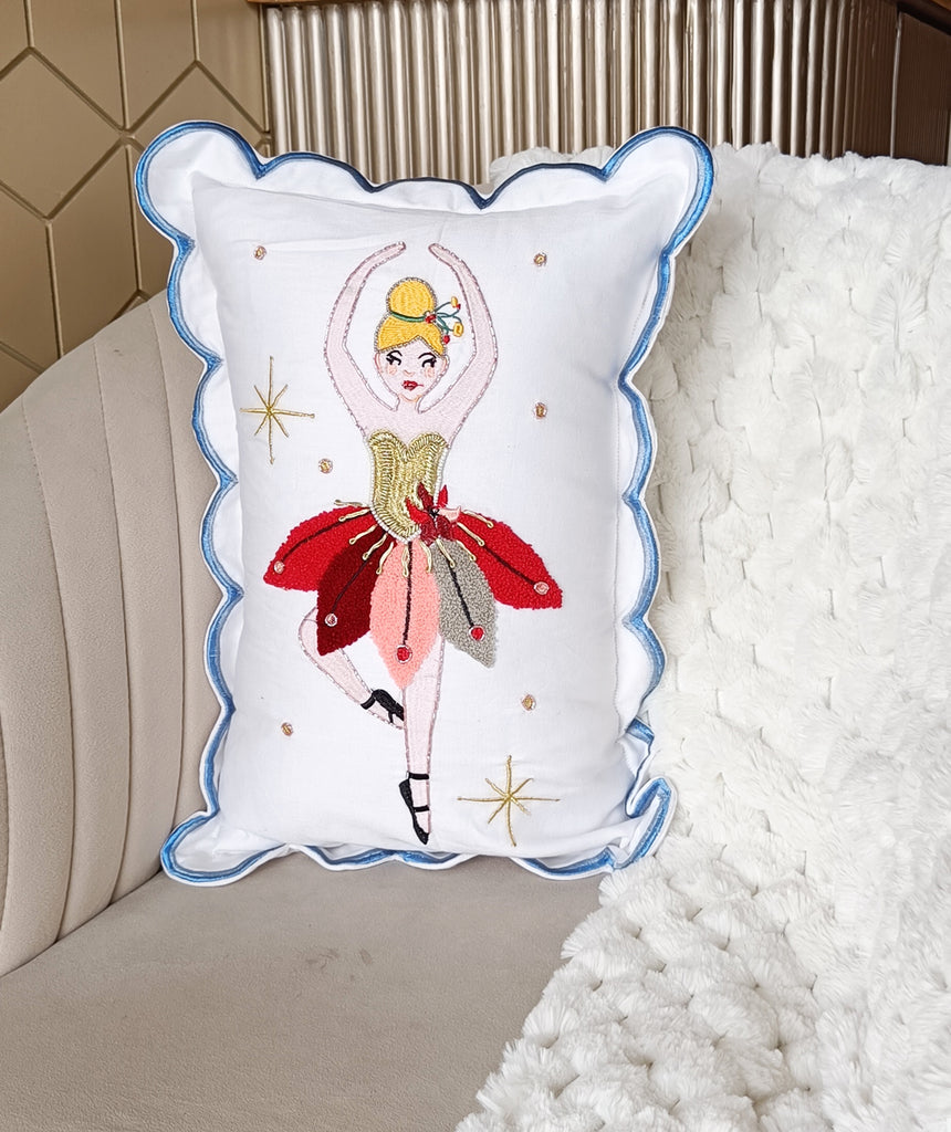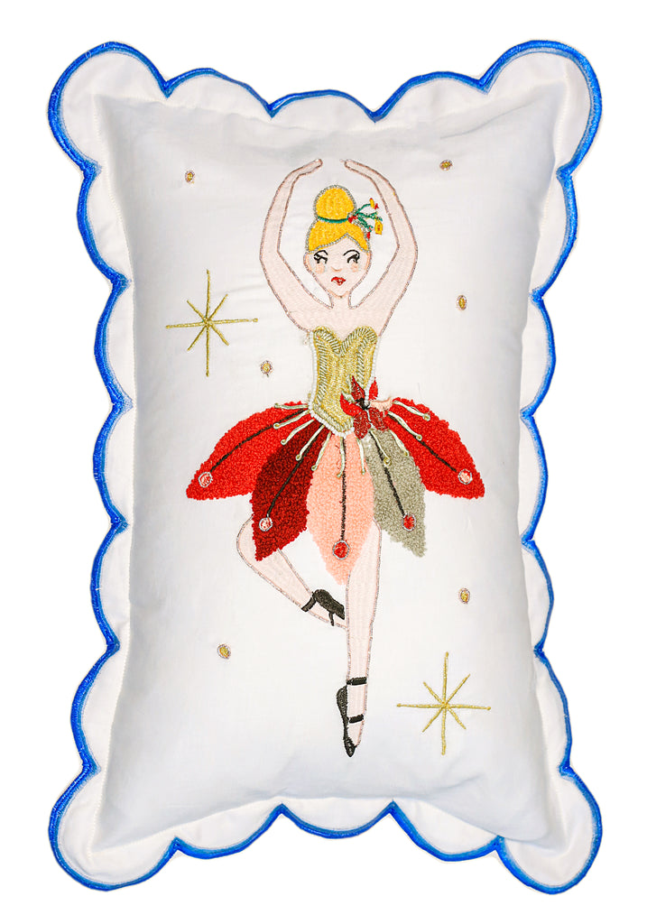 Grace your holiday décor with the delicate charm of our Christmas Ballerina Pillow. Crafted from soft cotton satin, this 14x20 inch accent pillow features a beautifully embroidered ballerina design and elegant scalloped edging for a touch of festive whimsy.