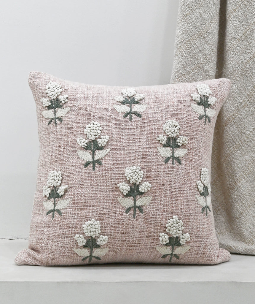 Add elegance to your home with this 20"x20" Vibhsa Persian pillow, featuring intricate hand embroidery, French knots, and Mughal Butah floral details.