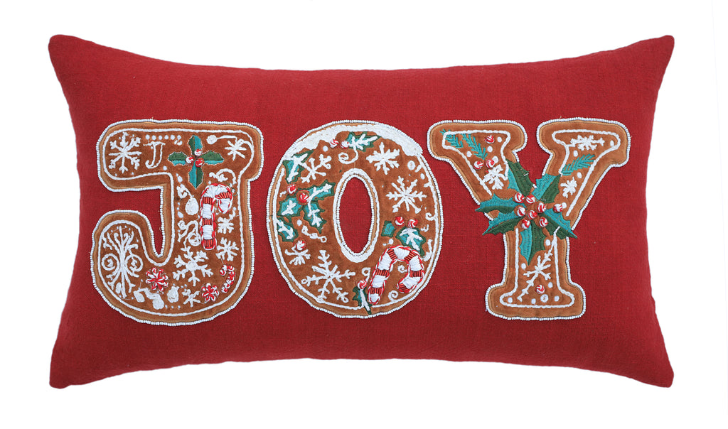 Celebrate the season with timeless warmth and texture. The Christmas Joy Pillow features a rich blend of velvet appliqué and intricate hand-embroidered detailing on soft, textured cotton. Sized at 14x24 inches, it makes a bold yet elegant statement in any festive setting.